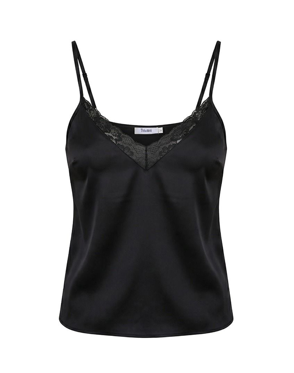 Γυναικείο τοπ, σε κανονική γραμμή, με λεπτές ρυθμιζόμενες τιράντες, σατινέ ύφανση και V ντεκολτέ με ασορτί δαντέλα. (Σύνθεση: 100% Βισκόζη)