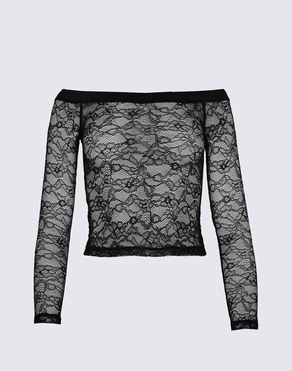 Γυναικεία μπλούζα, κοντή, ημιδιάφανη από δαντέλα, μακρυμάνικη, με ακάλυπτους ώμους. (Σύνθεση: 92% Πολυαμίδιο, 8% Ελαστάνη)