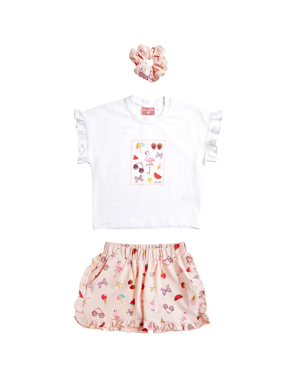 Βρεφικό σετ με κοντομάνικο τοπ, με στάμπα και βολάν μανίκια και μονόχρωμο σόρτς με τσέπες και ελαστική μέση. Διαθέτει λαστιχάκι μαλλιών. Ηλικία: 18 Μηνών - 5 Ετών (Σύνθεση: 95% Βαμβάκι, 5% Ελαστάνη)