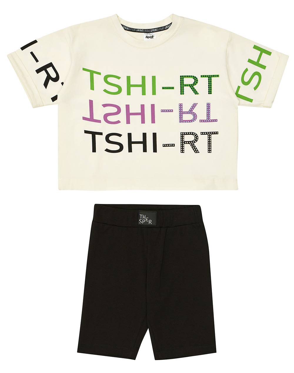 Παιδικό αθλητικό σετ ένδυσης, το οποίο διαθέτει κοντομάνικο τοπ με τύπωμα "TSHI-RT” με strass λεπτομέρειες και κολάν τύπου biker με ελαστική μέση. Ηλικία: 7 - 16 ετών. (Σύνθεση: 95% Βαμβάκι, 5% Ελαστάνη)