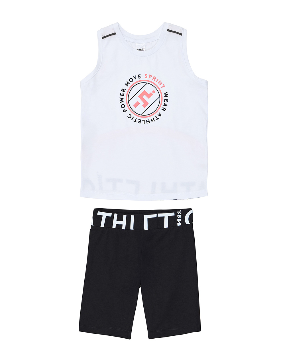 Παιδικό αθλητικό σετ ένδυσης, με αμνάνικο τοπ με τύπωμα “Power Move” μπροστά και “Athletic” στην πλάτη και διαθέτει κολάν biker με ελασική μέση. Ηλικία: 8 - 16 ετών. (Σύνθεση: 95% Βαμβάκι, 5% Ελαστάνη)