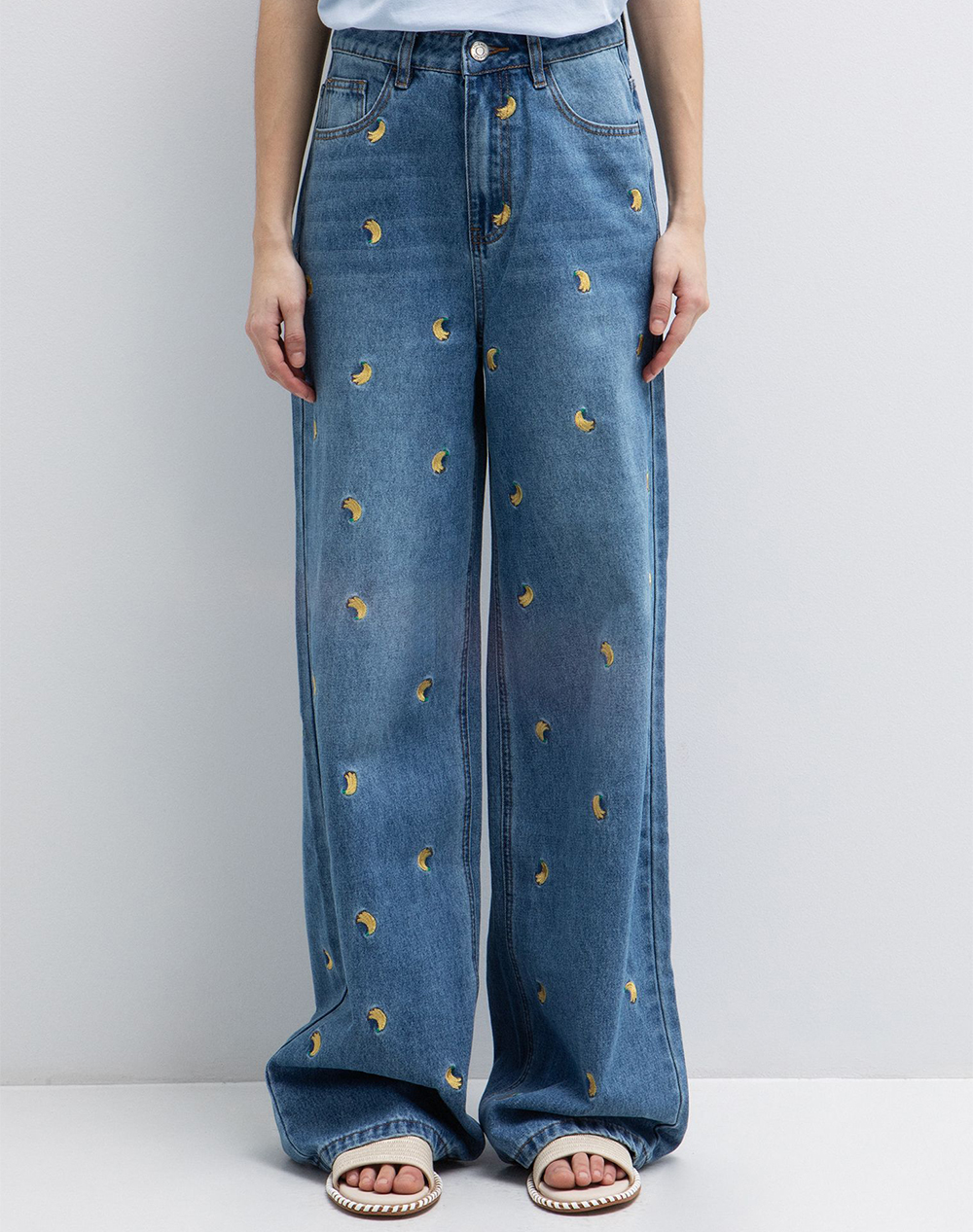 Γυναικείο τζιν παντελόνι σε ίσια γραμμή, ψηλόμεσο, με all over ανάγλυφο μοτίβο, πεντάτσεπο σχέδιο και κλείσιμο με φερμουάρ και κουμπί. . (Σύνθεση: 100% Βαμβάκι)