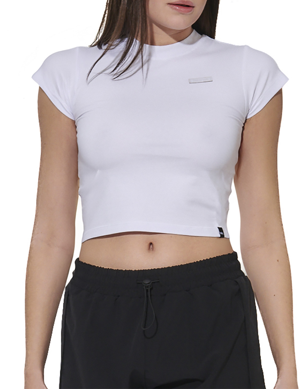 Γυναικείο crop t-shirt, σε κανονική γραμμή, κοντομάνικο, με bda logo στο στήθος και στρογγυλή λαιμόκοψη. (Σύνθεση: 96% Βαμβάκι, 4% Ελαστάνη)