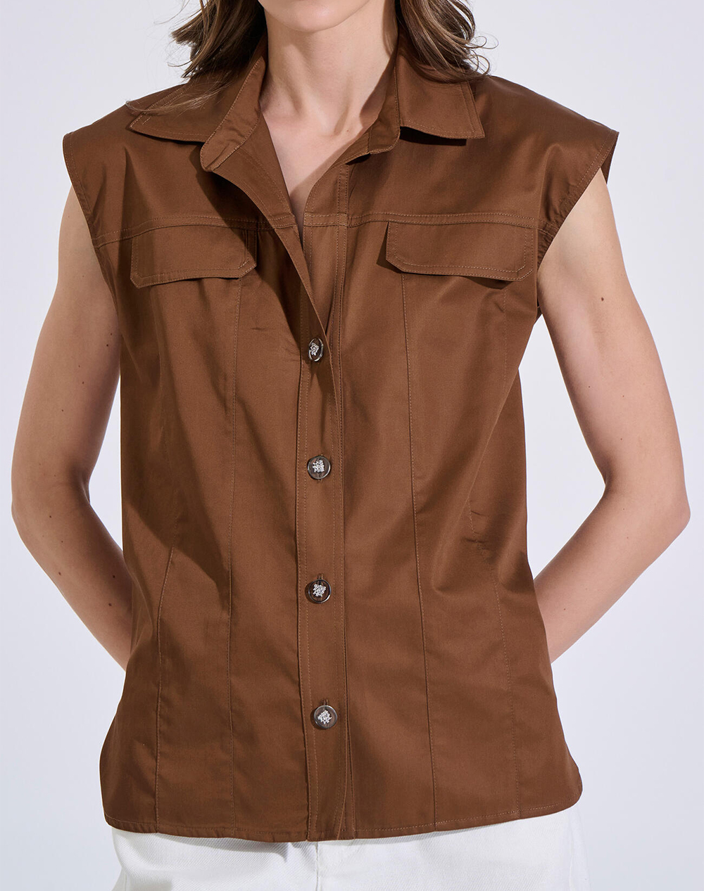 Γυναικείο αμάνικο πουκάμισο, σε κανονική γραμμή, με κλασικό γιακά, διακοσμητικές τσέπες στο στήθος, ζώνη στην πλάτη με μεταλλική αγκράφα και κλείσιμο με κουμπιά μπροστά. (Σύνθεση: 100% Βαμβάκι)