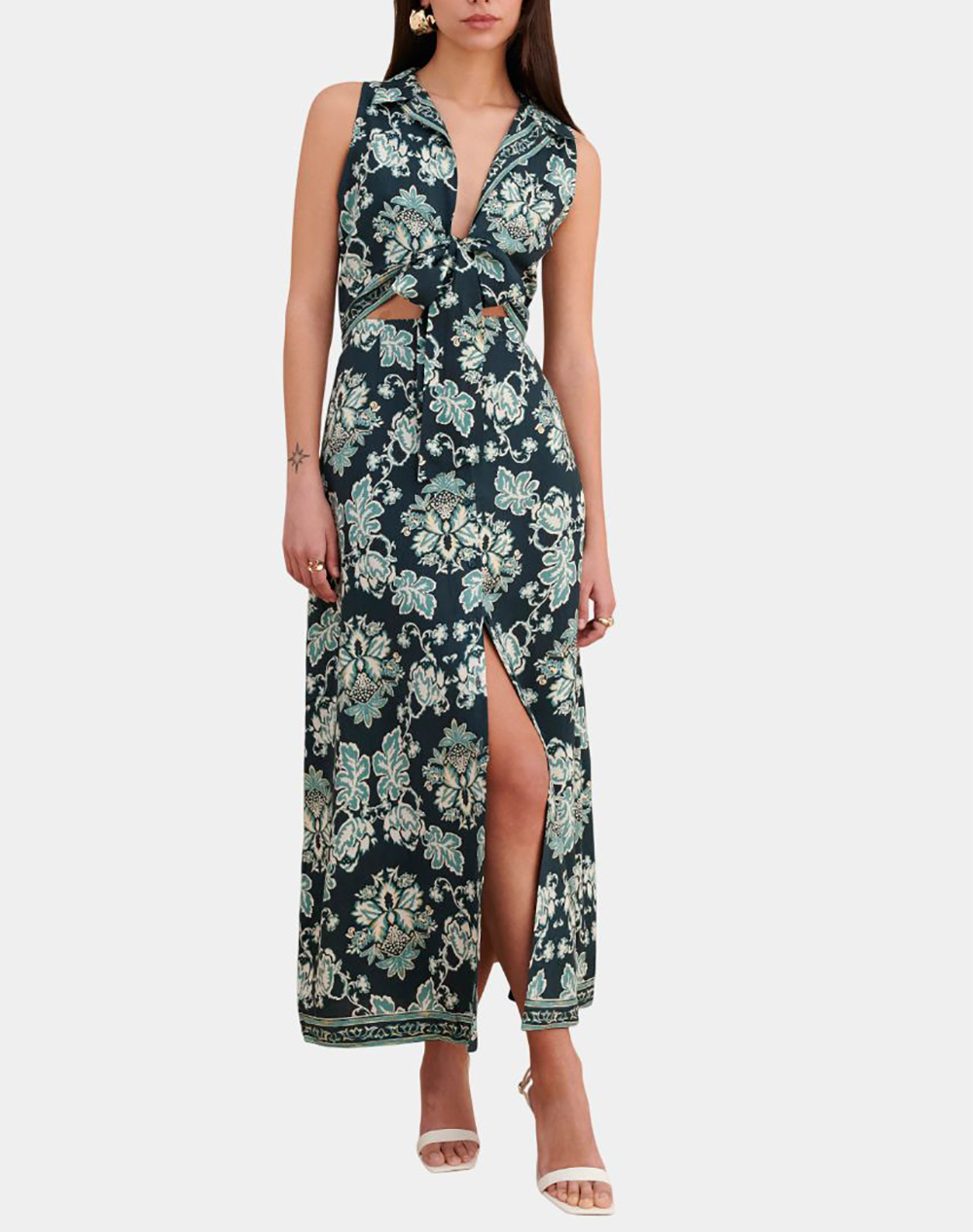 Γυναικείο maxi φόρεμα, αμάνικο, με γιακά, floral μοτίβο, cut out λεπτομέρεια μπροστά και σκίσιμο στο κάτω μέρος. (Σύνθεση: 100% Μονταλ)
