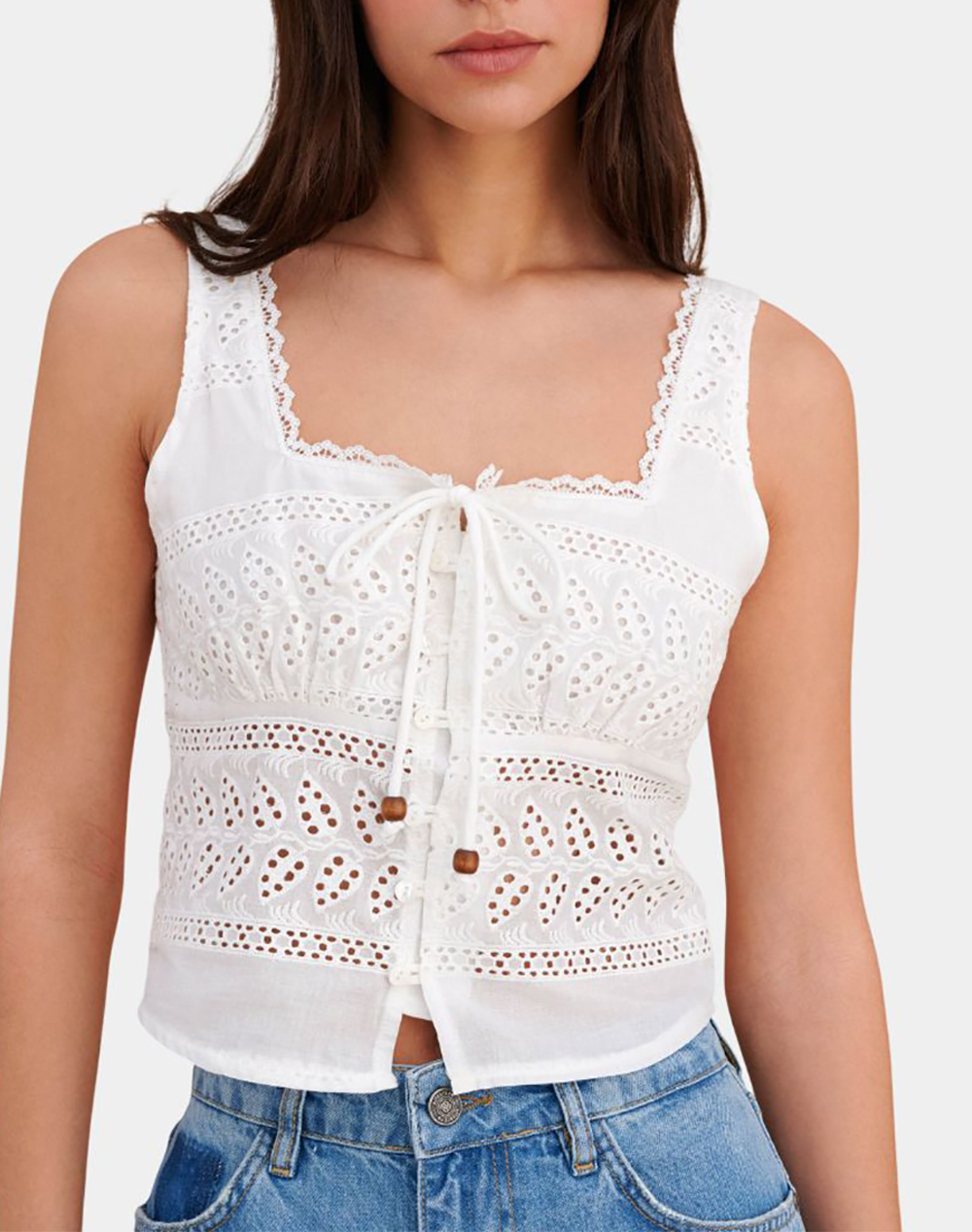 Γυναικείο τοπ, με φαρδιές τιράντες, τετράγωνη λαιμόκοψη, διάτρητο μοτίβο, κλείσιμο με κουμπιά και δέσιμο. (Σύνθεση: 100% Βαμβάκι)