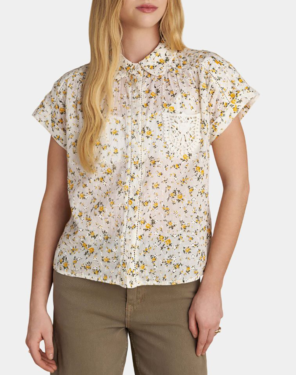 Γυναικείο πουκάμισο, σε κανονική γραμμή, κοντομάνικο, με φλοράλ κιπούρ μοτίβο, δαντελένια τσέπη στο στήθος και κλείσιμο με κουμπιά μπροστά. (Σύνθεση: 100% Βαμβάκι)