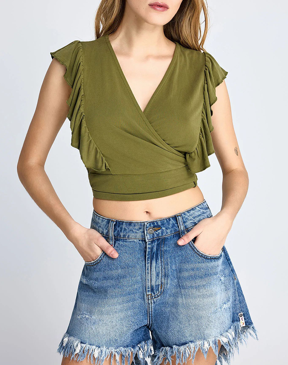 Γυναικείο cropped top, σε άνετη γραμμή, αμάνικο, με κρουαζέ σχέδιο, βολάν λεπτομέρειες και δέσιμο στο πλάι. (Σύνθεση: 65% Mondal, 35% Πολυεστέρας)