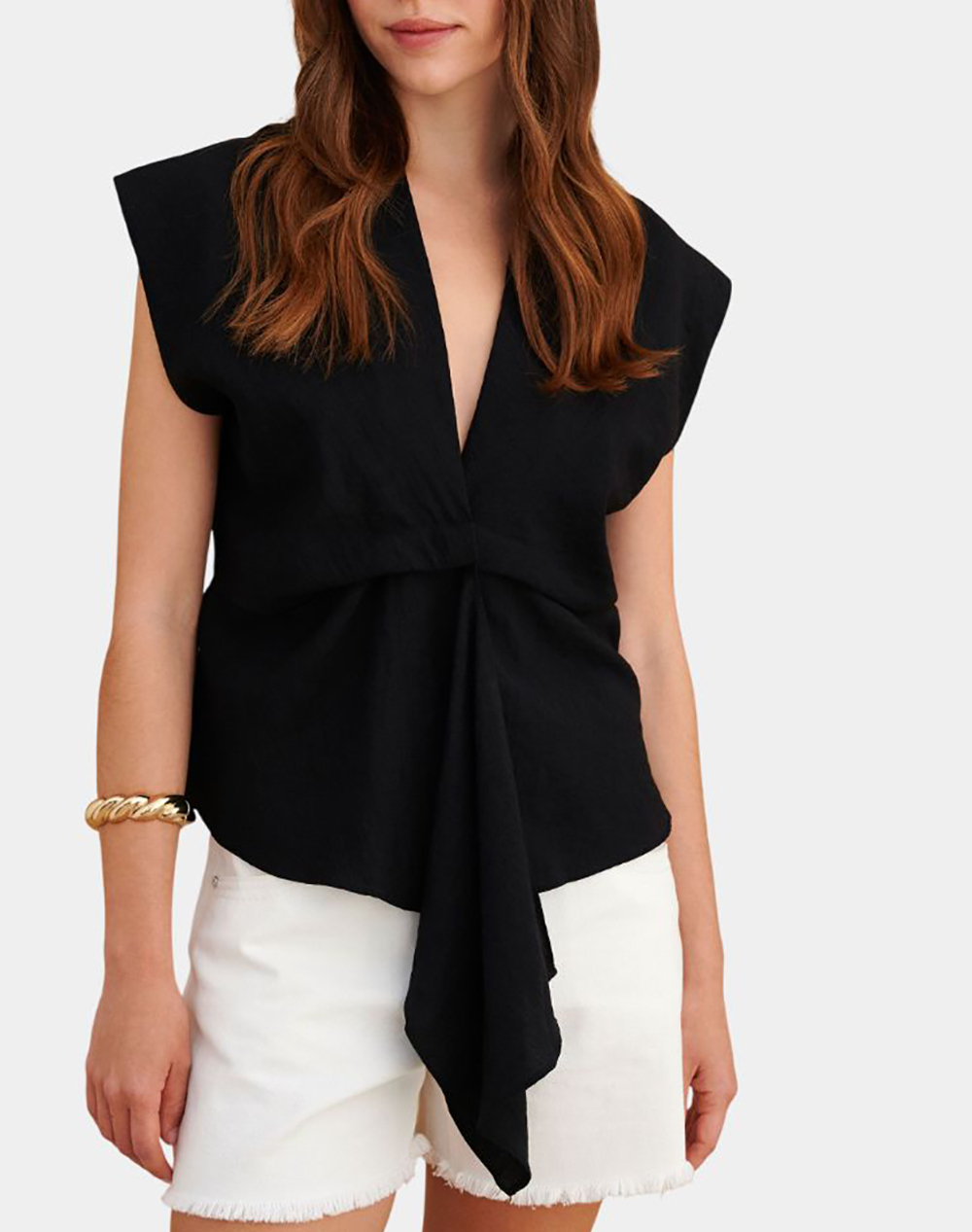 Γυναικείο ασύμμετρο τοπ, σε χαλαρή γραμμή, με V λαιμόκοψη και ιδιαίτερο σχεδιασμό. (Σύνθεση: 81% Βισκόζη, 15% Πολυεστέρας, 4% Πολυαμίδιο)