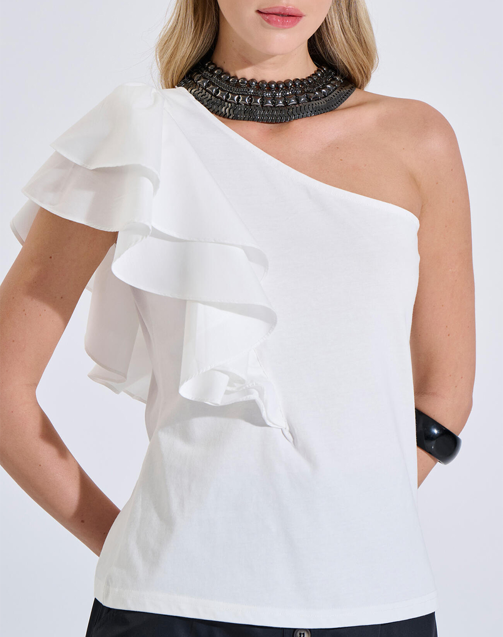 Γυναικεία μπλούζα, σε κομψή γραμμή, με έναν ώμο, συνδυασμό δύο υφασμάτων και ασύμμετρο βολάν. (Σύνθεση: 100% Βαμβάκι)