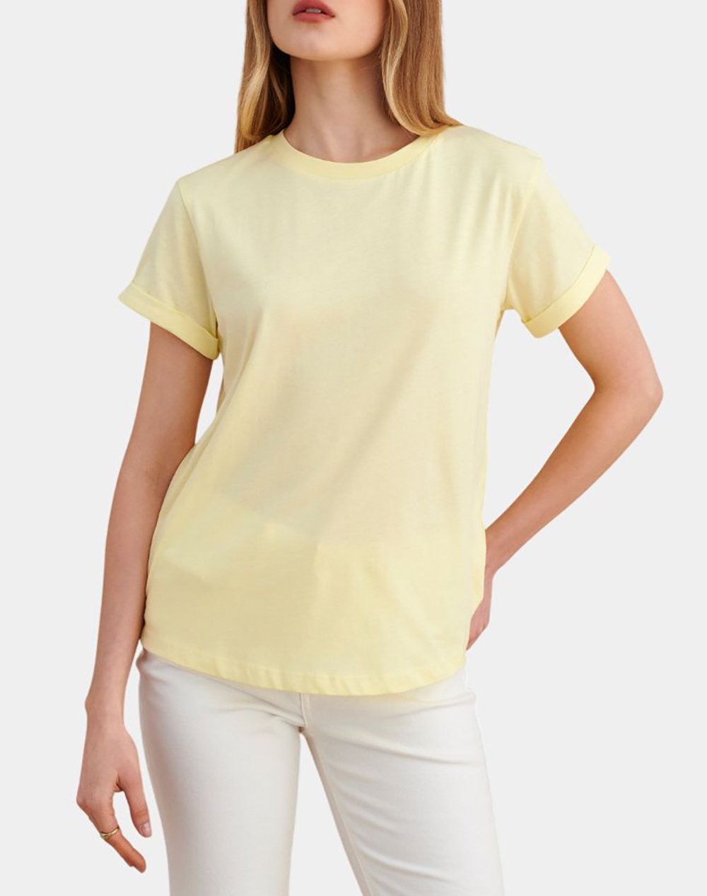 Γυναικεία μπλούζα, σε κανονική γραμμή, κοντομάνικη, με στρογγυλή λαιμόκοψη και ρεβέρ στα μανίκια. (Σύνθεση: 100% Βαμβάκι)