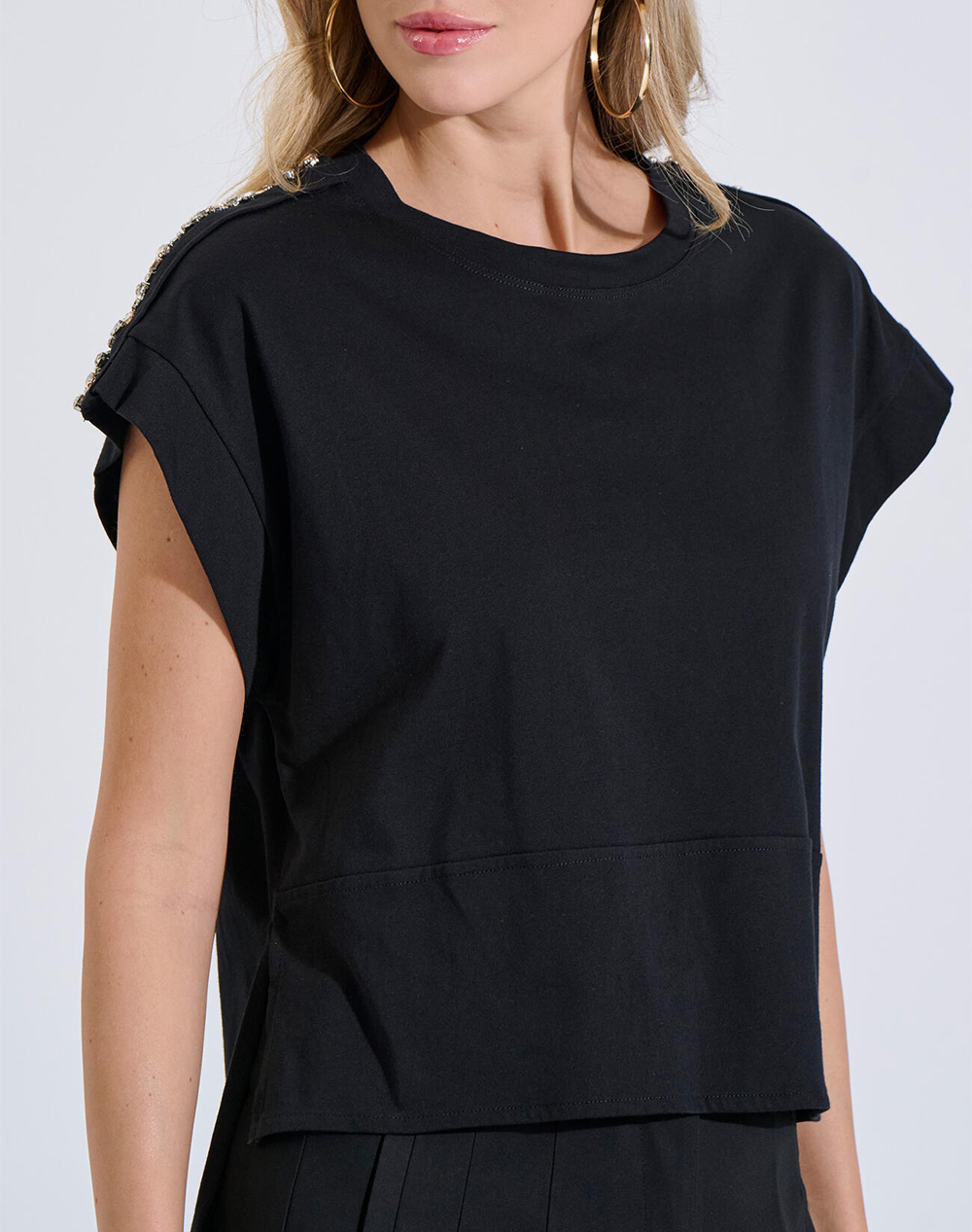 Γυναικεία μπλούζα, σε άνετη γραμμή, κοντομάνικη, με διακοσμητικά στράς στους ώμους και άνοιγμα στα πλαϊνά. (Σύνθεση: 100% Βαμβάκι)