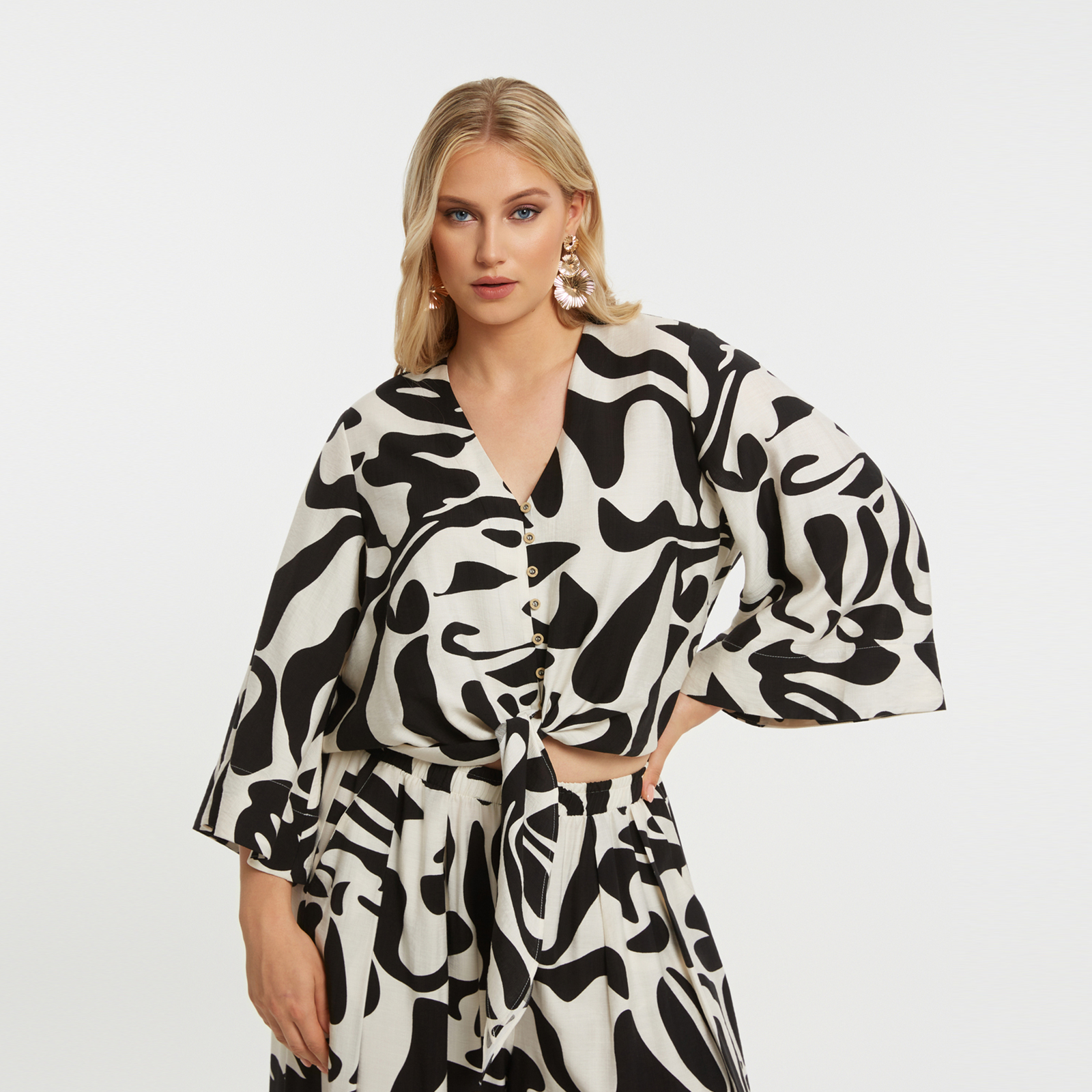 Εμπριμέ μπλούζα από βαμβακερό μείγμα με δέσιμο στο λαιμό