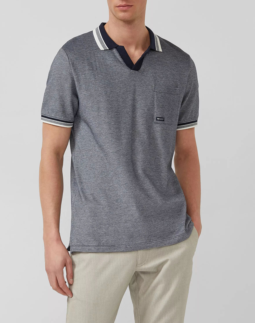 Ανδρική μπλούζα polo, σε κανονική γραμμή, κοντομάνικη, με "V" άνοιγμα στη λαιμόκοψη και λεπτομέρειες σε αντίθεση. (Σύνθεση: 100% Βαμβάκι)