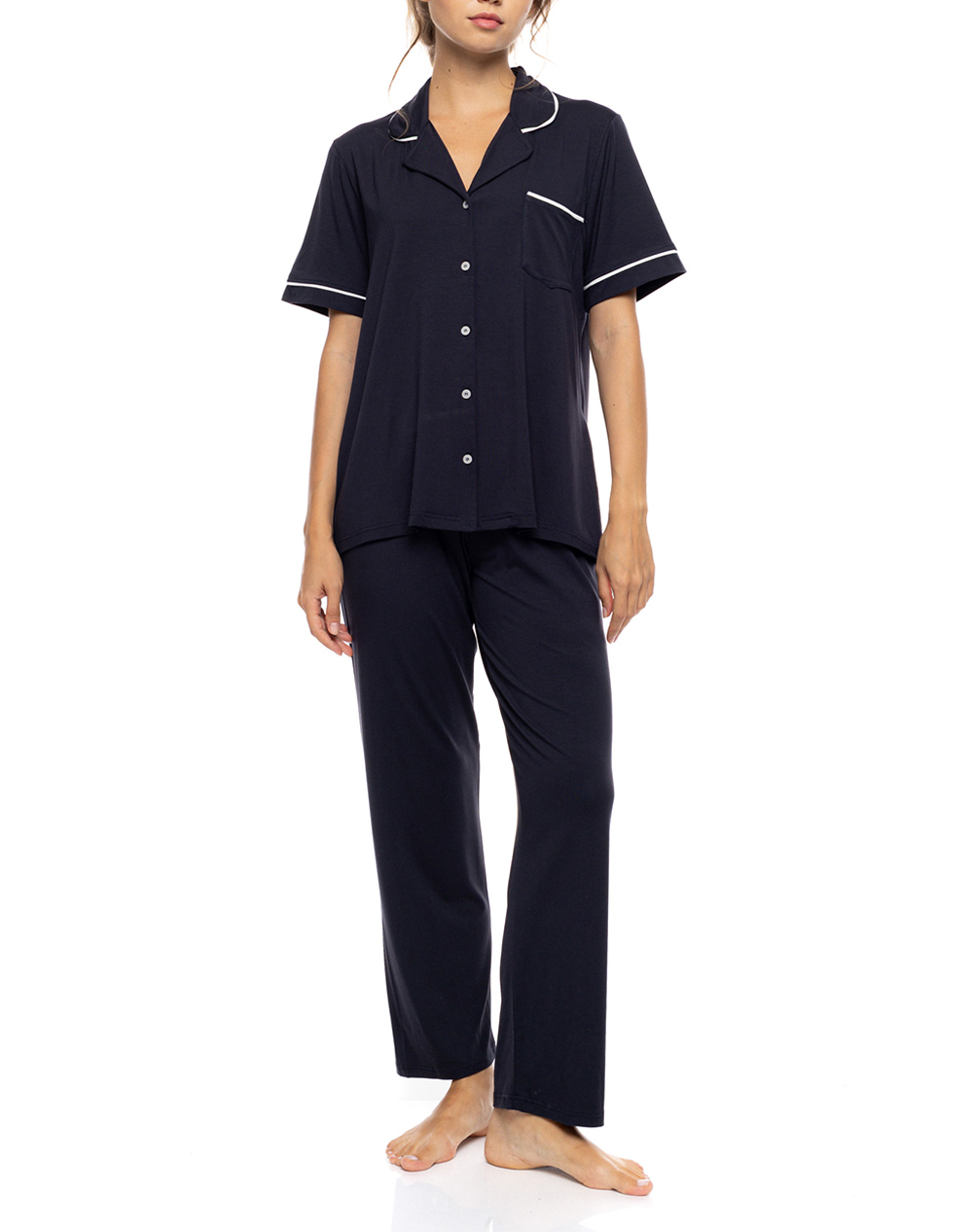 Γυναικεία πυτζάμα, διαθέτει κοντομάνικο τοπ με γιακά και κουμπιά και παντελόνι με ελαστική μέση. (Σύνθεση: 95% Bamboo, 5% Ελαστάνη)