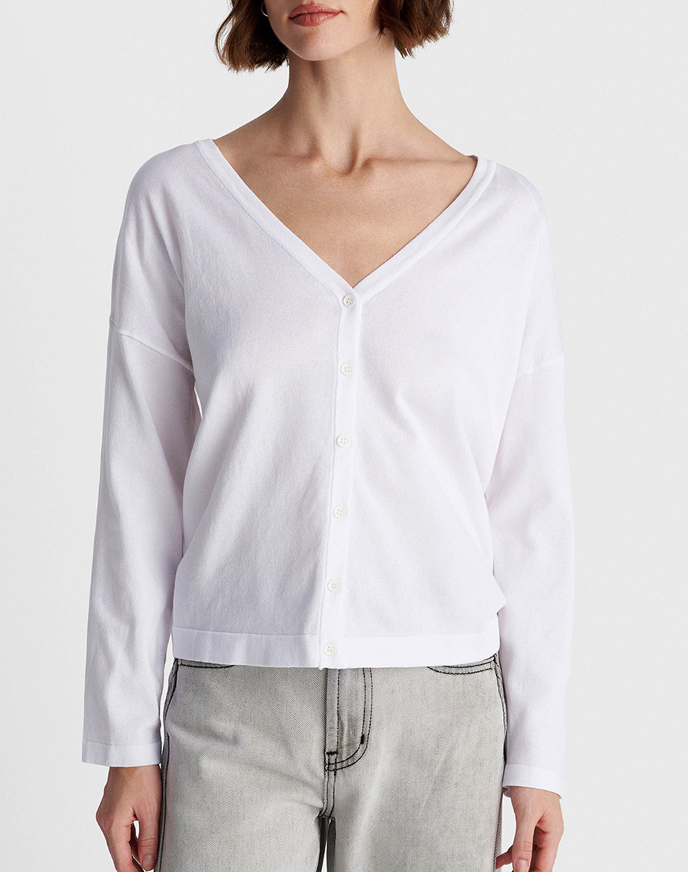 Γυναικεία ζακέτα,σε κανονική γραμμή, μακρυμάνικη, με V λαιμόκοψη και κλείσιμο με κουμπιά. (Σύνθεση: 51% Βισκόζη, 49% Βαμβάκι)