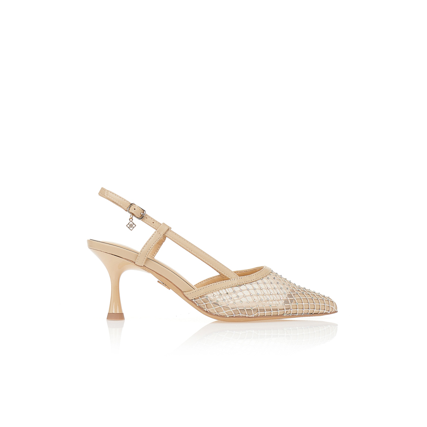 Γόβες mules nude σατέν με μπαρέτα και λουράκι στον αστράγαλο