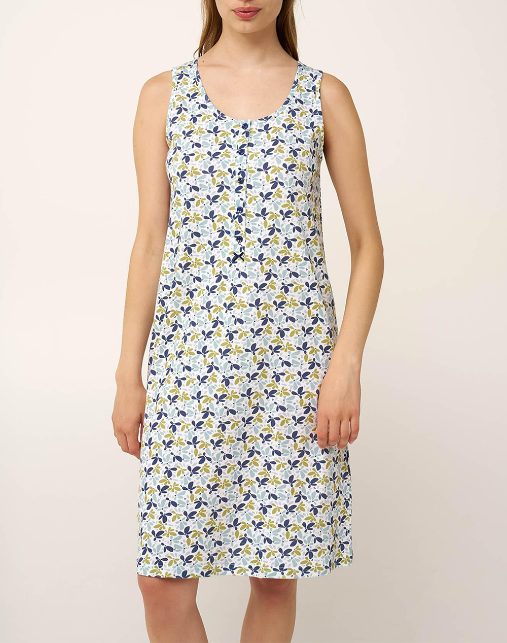 Γυναικείο νυχτικό, σε άνετη γραμμή, αμάνικο, με εμπριμέ μοτίβο και κουμπάκια στη λαιμόκοψη. (Σύνθεση: 100% Βαμβάκι)