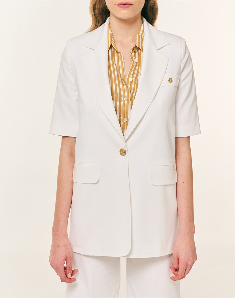 Γυναικείο μακρύ σακάκι, σε ίσια γραμμή, κοντομάνικο, με τσέπες, γιακά με πέτο και κλείσιμο με κουμπί. (Σύνθεση: 64% Βαμβάκι, 34% Πολυεστέρας, 2% Σπαντεξ)